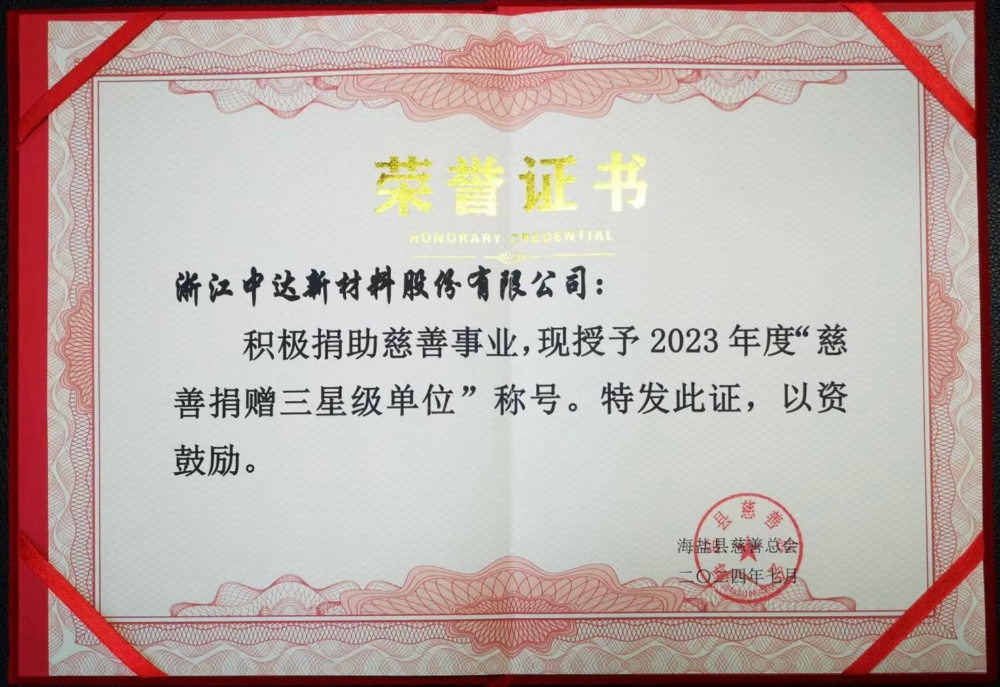 喜報(bào)!中達(dá)新材獲評(píng)2023年度慈善捐贈(zèng)三星級(jí)單位